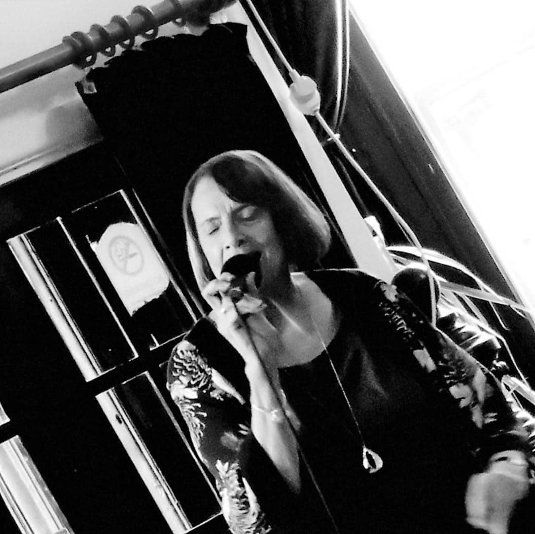 black and white photo of jazz singer Annie Long, a woman with shoulder-length dark hair, singing into a microphone