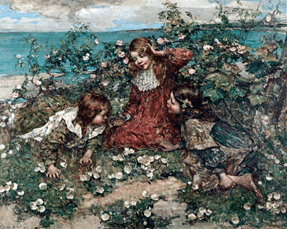 3 little girls in a garden. Playing in a flower bush with the sea in the background.